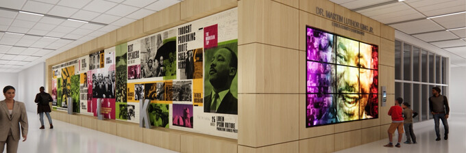 The first-floor lobby is a vibrant monument to the life and legacy of Dr. King. A large mural that occupies one of the walls includes photos of and quotes by Dr. King. There also is a large-screen television which plays a curated video of a host of Dr. King’s thought provoking quotes that was specially created just for this building. I designed the timeline mural and tenant pillars with interior designer Terri Haskins of Hackensack.