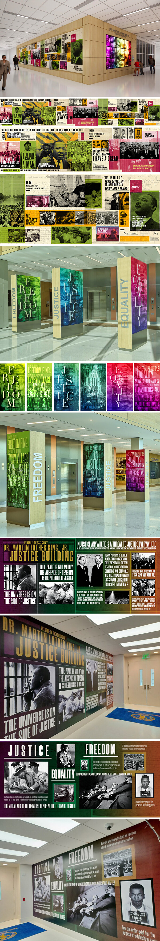 Collaborating with interior designer Terri Haskins and architect Duane Dancy, we decided the best approach was to use the main corridor as a vibrant, larger than life timeline in tribute to the legacy and leadership of MLK. Captured within the colorful, multi-dimensional montages are some of the most poignant moments during his civil rights campaign, which culminates in a perpendicular video wall highlighting images and quotes from the timeline in a continuous 7 minute video.