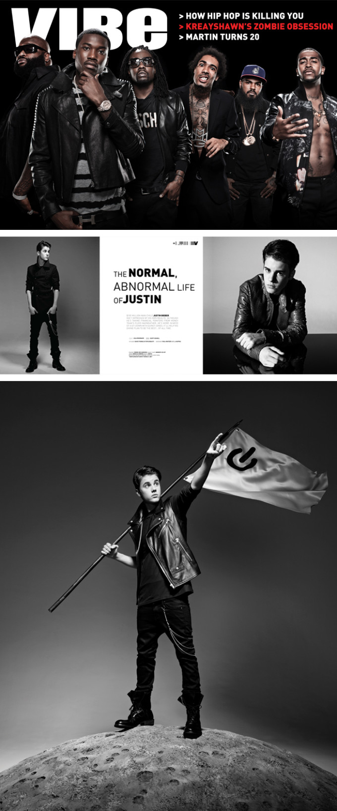 VIBE Magazine/Maybach Music Group/Justin Bieber issue allowed for great contrast inside and out specifically pop vs hip hop. The Justin Bieber feature in particular focused on Justin’s transition from teen phenom to adult superstar.