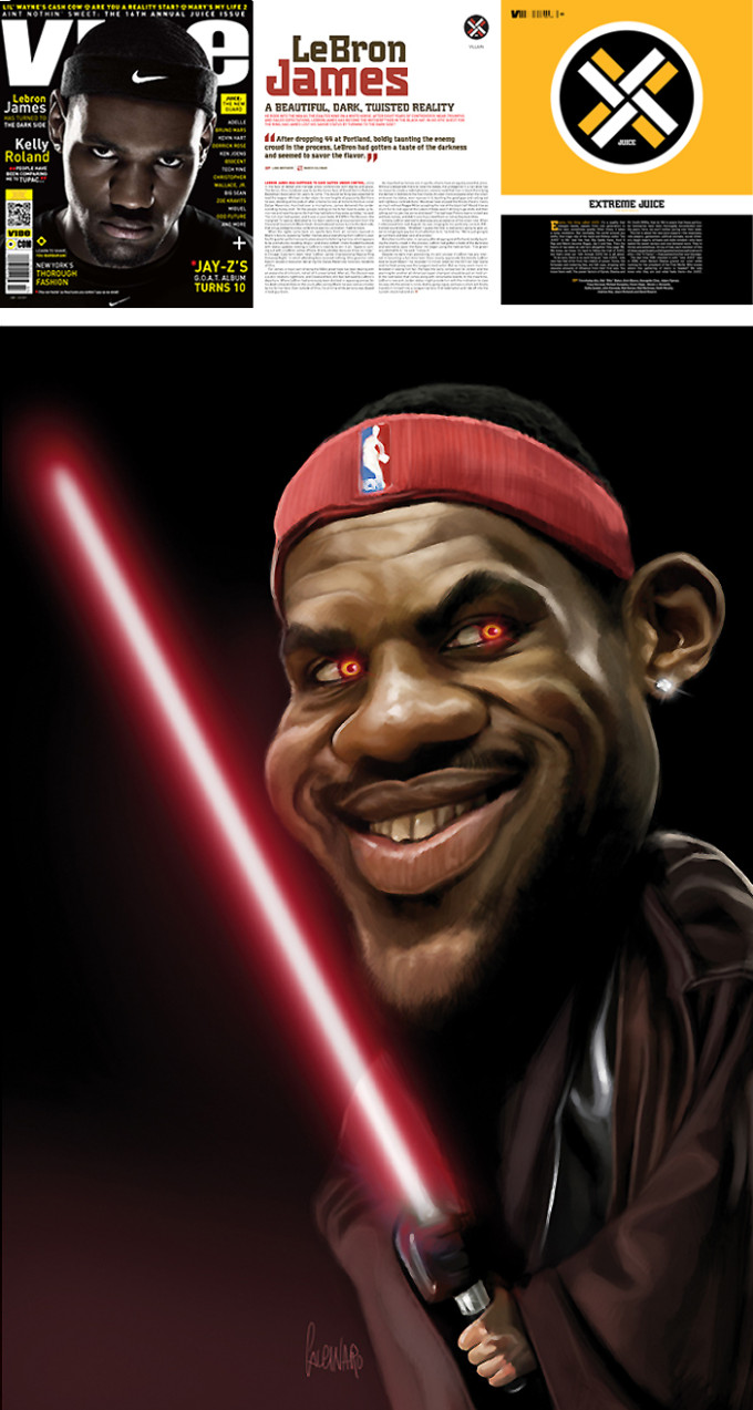 To illustrate Lebron James’ new role as villain and conceptually portray him in the role of Anakin Skywalker, the hero turned villain, red eyed and light saber glowing with the manifestation of evil intent. I chose illustrator Marco Calcinaro to execute this task as I felt that he was not only amazing at caricatures but also had an amazing way of imbuing them with energy and emotion in a fashion that embodied the negative feelings surrounding LeBron James’ move to the Miami Heat.