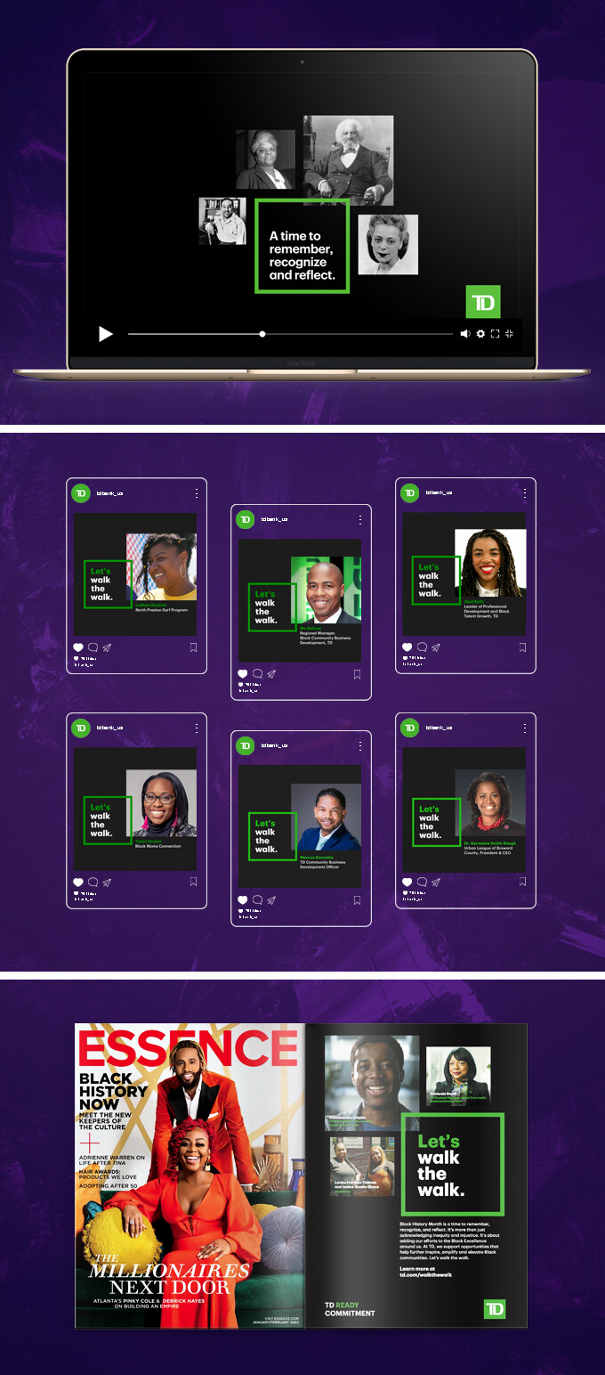 TD Bank wanted to go beyond highlighting examples of “Black Excellence” during Black History Month for all of North America. This campaign would focus on amplifying, elevating and inspiring community members by showing what rolling up sleeves, supporting their efforts and walking the walk together looks like. Video and static assets together with the campaign message, “Walk The Walk” were aired online and on social media platforms, championing community rising stars through programs like TD ready commitment where TD aligns with their efforts and invites other community members to join in as well. The campaign videos got over 500K combined online and social impressions during Black History Month while more than doubling the previous year’s results during the same time period.